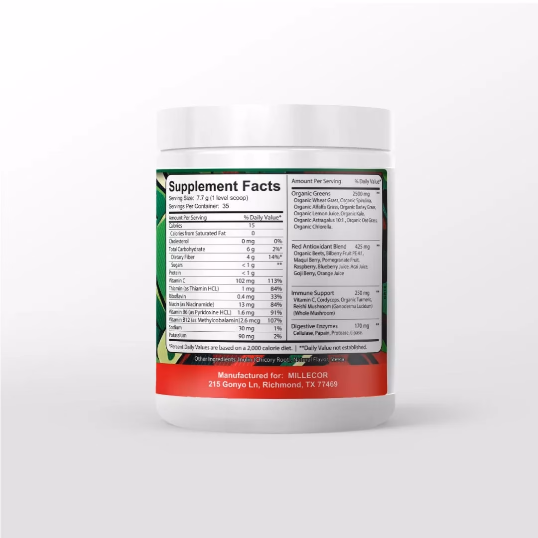 • 2500 mg Greens Super Food • 425 mg Super Reds